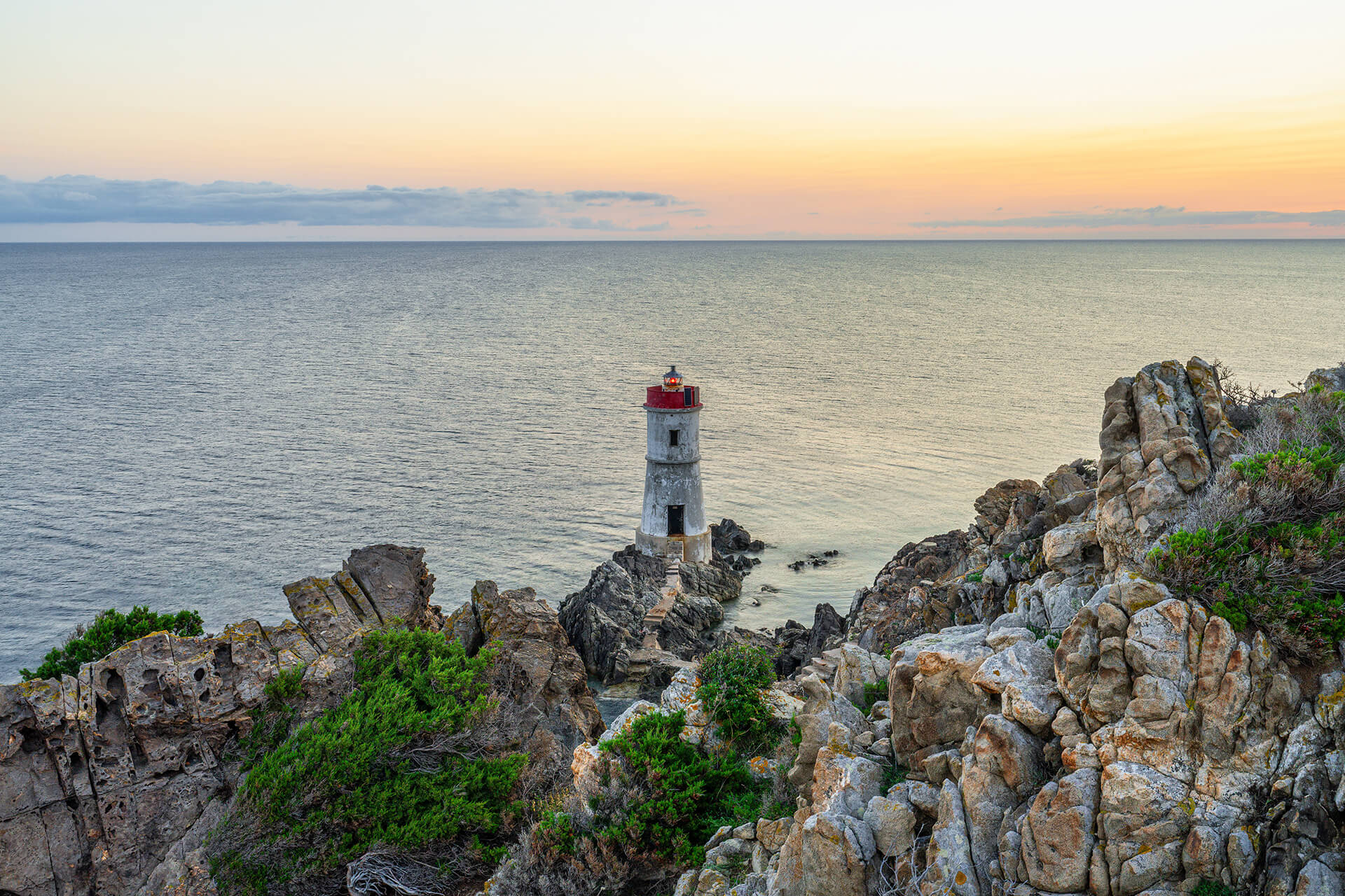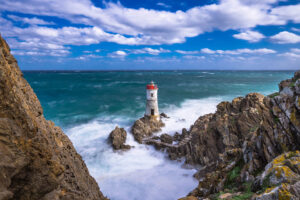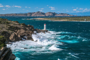 Silenzioso e immobile osserva l’orizzonte. Del mare apprezza l’impetuosità delle onde o la superficie calma, nei momenti di bonaccia. Il fanale di Capo Ferro svetta, tra gli scogli, nel tratto di costa del comune di Arzachena, a breve distanza da Porto Cervo. Un luogo magico da cui si apprezzano suggestivi tramonti e albe da sogno. Alle sue spalle, ancora più imperioso, il faro solitario spicca dal basso promontorio che lo rende visibile, in quel tratto di costa, dal 1861, quando fu acceso per la prima volta. Una tappa imprescindibile per chi cerca un angolo di pace per ammirare le sculture realizzate, sulle rocce, dalla perseveranza della natura. Il vento è la compagnia costante, come il gorgoglio del mare che, non di rado, si trasforma in tumultuoso frastuono, provocato da selvaggi cavalloni che si infrangono sulla costa. È tra le più belle celebrazioni di inusuale eleganza in un contesto di quiete e di caos, a seconda del meteo.